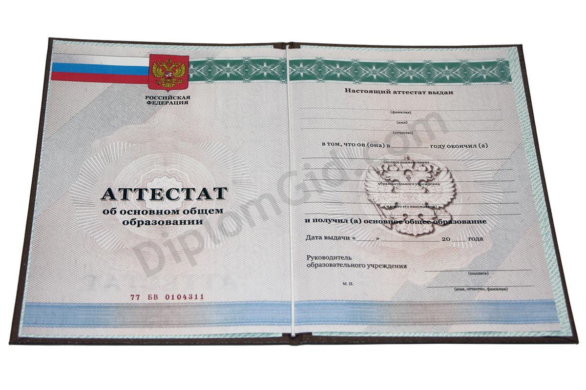 Аттестат школы об окончании 9 классов< на государственном бланке ("Гознак" со всеми степенями защиты). Выдача в 2010, 2011, 2012, 2013 годах.